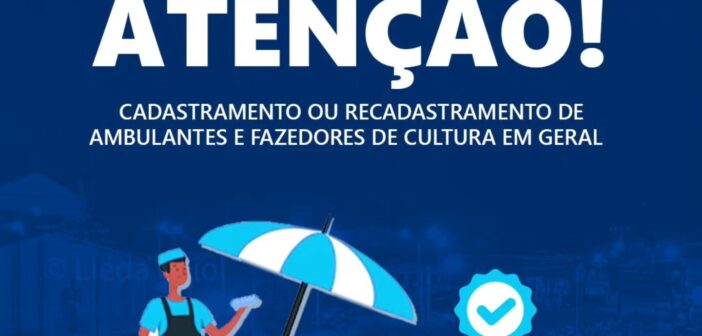 A partir de Segunda-feira, 03 de fevereiro, a Secretaria de Cultura, Comunicação e Esporte estará realizando o cadastramento e recadastramento para todos os ambulantes e também para todos os fazedores de cultura em geral.