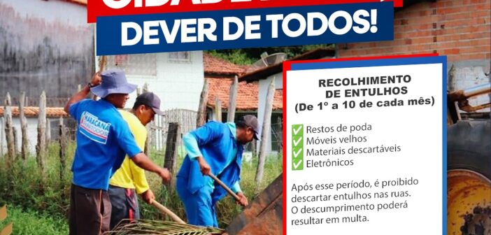 Do dia 01 ao dia 10 de cada mês é o período destinado para que os moradores coloquem entulhos, restos de poda, móveis velhos e materiais descartáveis nas calçadas, em frente às suas residências, para que sejam recolhidos pela equipe da limpeza pública.